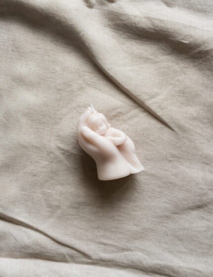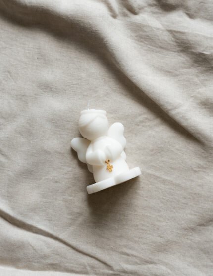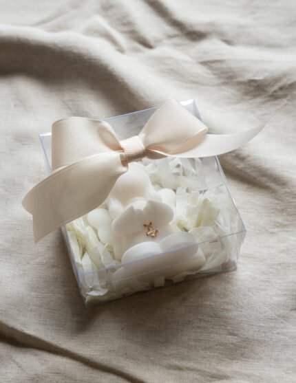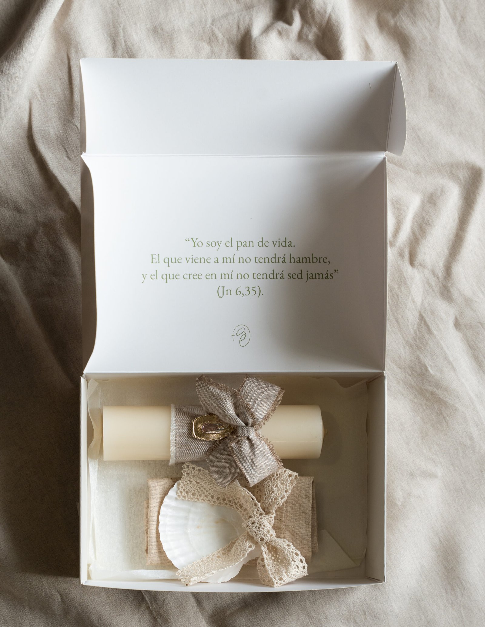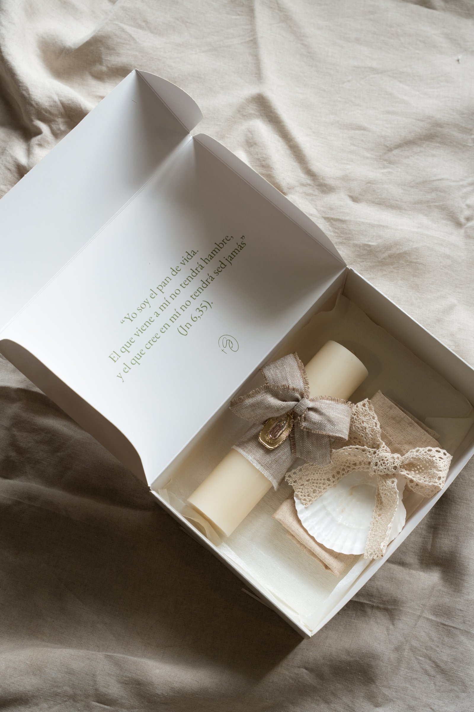 kit en caja con cirio con medalla virgen, pañuelo bautismal, concha bautismal con moño